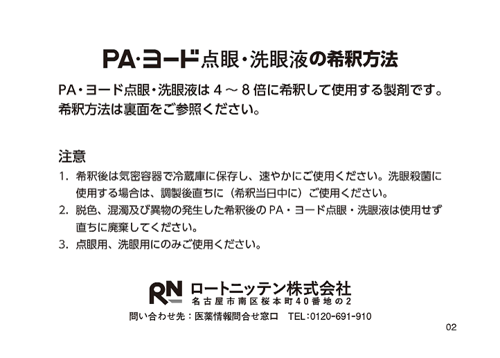 PA・ヨード点眼・洗眼液の希釈方法 PA・ヨード点眼・洗眼液は4~8倍に希釈して使用する製剤ですが、保冷庫から取り出した直後は粘性が高く、希釈操作が困難です。そのため、希釈に適した液温(約25℃)に温めるための方法等をご紹介する説明書を作成しています。説明書でご紹介する方法はあくまで一例ですが、PA・ヨード点眼・洗眼液を希釈調製される際にご参照ください。 説明書ダウンロード