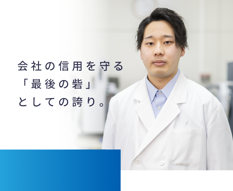 点眼薬となる原料のサンプリング、理化学的な試験が主な業務です。品質管理では検体の採取をし、チームで分担して様々な試験を行い、その結果によって製品に使用できる品質か否かを判断します。品質管理は「ただ試験をするだけ」と思われがちですが、製品の品質を決める重要なポジション。いわば、当社の信用を守る「最後の砦」だと思っています。点眼薬は患者さまの目に直接触れるもの。だからこそ、責任感を持って高い品質を追求し、当たり前の安心を約束する。そんな品質管理の仕事にやりがいを感じています。